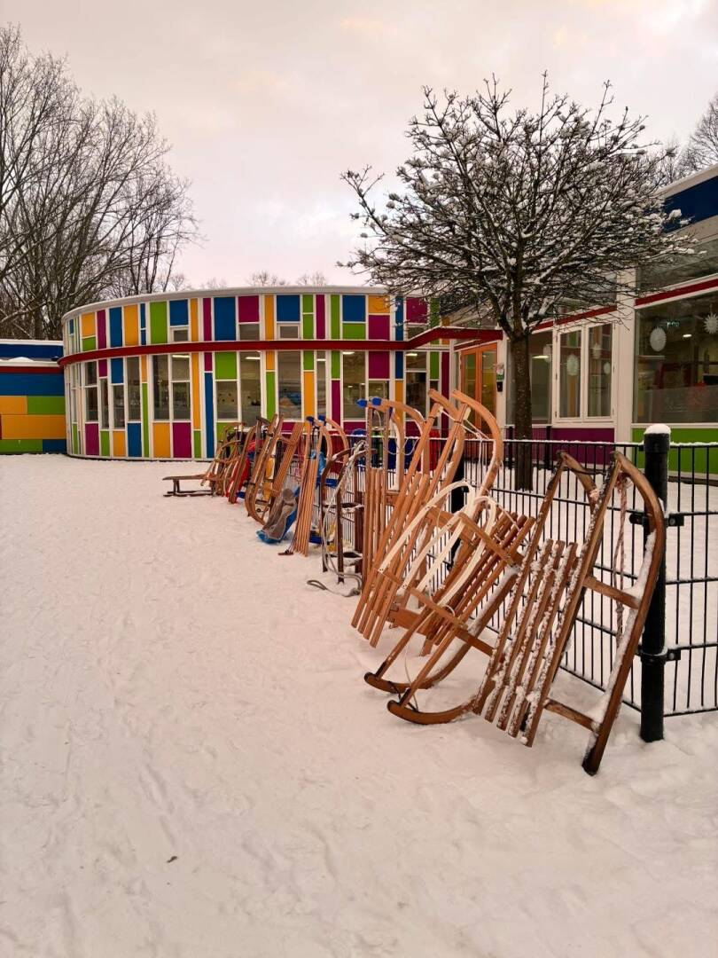 De fietsenstalling van De Kriekenhof is leeg de afgelopen dagen, maar de slee-stalling staat aardig vol!