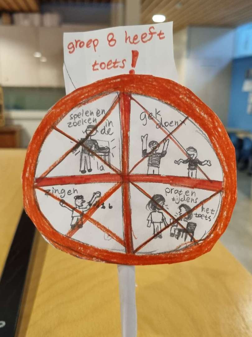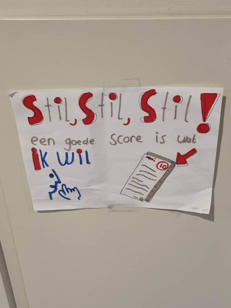 Als voorbereiding op de toets ochtenden, maakten de kinderen bordjes met daarop kreten en tekeningen om iedereen in de school duidelijk te maken, dat ze bezig zijn met dè toets en of iedereen daar wel rekening mee wil houden!